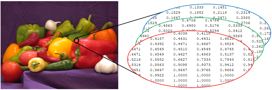 เอาง่าย ๆ อย่างรูปภาพ ผมน่าจะเคยพูดในเพจหลายรอบแล้วว่ารูปภาพคือตัวเลข แต่ละพิกเซลก็จะเก็บค่าสีของมันไว้ ถ้าเป็นขาวดำก็ใช้เลขหนึ่งตัว ถ้าเป็นภาพสีในระบบ RGB ก็ใช้เลข 3 ตัวเพื่อแสดงค่าสีแดง สีเขียว และสีน้ำเงิน