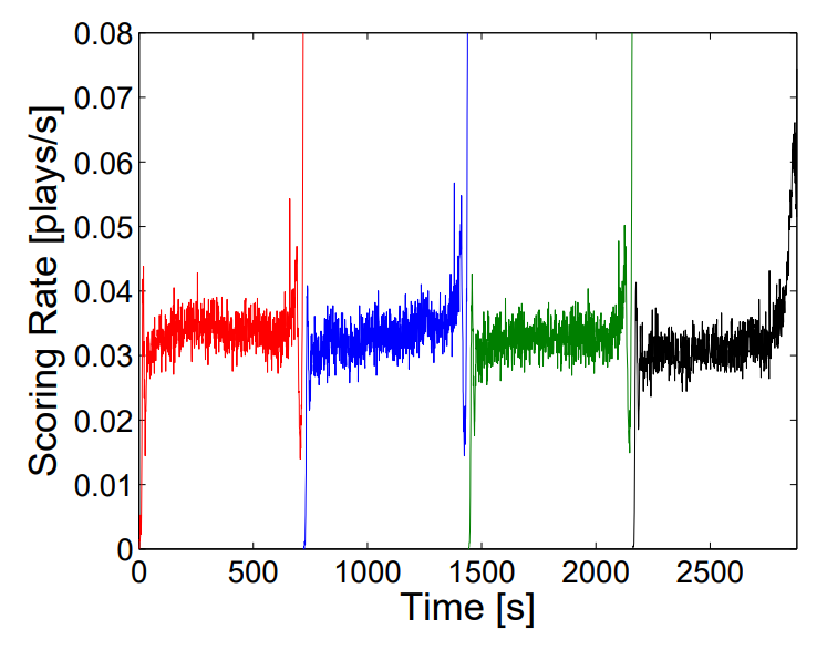 พวกเขาพบว่าทีมที่ตามจะมีแนวโน้มที่จะทำแต้มได้มากตามจำนวนแต้มที่ตามอยู่ สิ่งนี้สะท้อนถึงพฤติกรรมของมนุษย์ที่ทีมที่นำอยู่มักเล่นอย่างผ่อนคลายมากขึ้น ขณะที่ทีมที่ตามหลังพยายามเร่งเกมเพื่อกลับเข้าสู่การแข่งขัน โดยจากการเอาข้อมูลประมวลผลในแบบจำลอง Random Walk ที่สร้างขึ้นพบว่าได้ความน่าจะเป็นที่แต่ละทีมจะเป็นฝ่ายทำแต้มได้คือ
