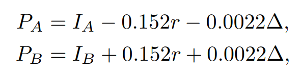 โดยที่ ตัวแปร P คือความน่าจะเป็นที่ทีมนั้นจะทำแต้มได้ ตัวแปร I คือความได้เปรียบจากความเก่งของทีม ตัวแปร r มีค่าเป็น +1 เมื่อแต้มที่แล้วเป็นของทีม A และมีค่าเป็น -1 เมื่อแต้มที่แล้วเป็นของ B และตัวแปร Δ คือผลต่างของแต้มระหว่างสองทีม ซึ่งแปลว่าหากแบบจำลองนี้ถูก เราจะสามารถจำลองแต้มของกีฬาบาสเกตบอลสักเกมได้ด้วยการโยนเหรียญที่กำหนดความน่าจะเป็นที่จะออกหัวและก้อยตามสมการนี้