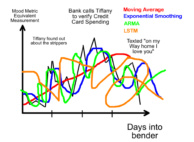 เพื่อสร้างแบบจำลองพยากรณ์อารมณ์ทิฟฟานี ดร.แชดใช้เครื่องมือทางด้าน Time Series Analysis ทั้งหมด 4 อย่าง ประกอบด้วย การคำนวณ Simple Moving Average การทำ Sextuple Exponential Smoothing ซึ่งเป็นขั้นกว่าของ Exponential Smoothing ทั่วไป การใช้โมเดล ARMA และสุดท้ายคือ LSTM ซึ่งเป็น Machine Learning ที่ใช้เพื่อวิเคราะห์ข้อมูล time series