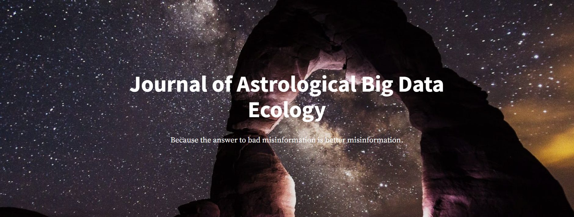 Journal of Astrological Big Data Ecology เป็นวารสารที่ประกาศตัวชัดเจนว่าเป็นวารสารทางวิชาการปลอม ๆ ที่ตีพิมพ์งานวิจัยปลอม ๆ ในหัวข้อปั่น ๆ ที่เอาไปอ้างอิงอะไรทางวิชาการไม่ได้ เพราะไม่มีอะไรเป็นเรื่องจริงสักอย่าง คนเขียนก็เหมือนจะใช้ชื่อปลอม อ้างอิงงานวิจัยปลอม ๆ ใครมีเวลาว่างมาก ๆ ลองกดเข้าไปดูก็ได้ฮะ ว่าเขาตีพิมพ์บทความอะไรบ้าง