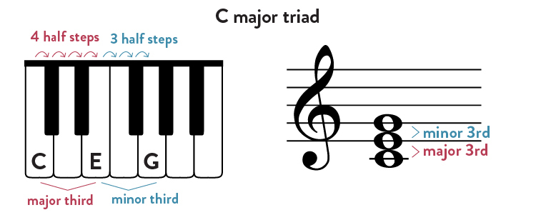 ไทรแอดแบบ major ประกอบขึ้นมาจากโน้ตตัวแรกซึ่งคือราก ต่อด้วยโน้ตตัวที่อยู่ในตำแหน่งที่นับไปจากรากสี่ครึ่งเสียง และถัดไปอีกสามครึ่งเสียง เช่น C major ก็จะประกอบด้วยโน้ตตัวแรกคือ C ซึ่งมีค่า 0 จากนั้นบวกไปอีกสี่ตำแหน่งได้ 4 นั่นคือ E และบวกต่อไปอีกสามตำแหน่ง คือ 7 ซึ่งคือ G รวมกันเรียกว่า C major ไทรแอด เขียนได้เป็น [C,E,G] หรือ [0,4,7] นั่นเอง