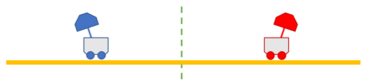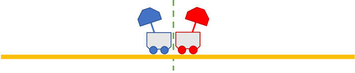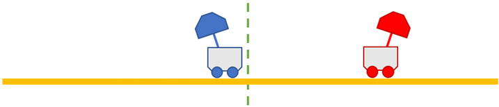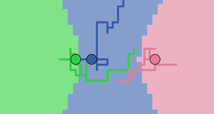 เพื่อให้เห็นภาพ สมมติว่าบนชายหาดแห่งหนึ่งมีร้านไอศกรีมสองร้าน น้ำเงินกับแดง ถ้าเราสมมติว่าคนในหาดจะเลือกไปกินร้านที่ใกล้กว่า และคนกระจายตัวกันอย่างสม่ำเสมอทั้งหาด ถ้าทั้งสองร้านตั้งอยู่ในตำแหน่งตามรูปข้างล่าง ทั้งสองร้านก็จะแบ่งลูกค้ากันคนละครึ่งถูกไหมฮะ
