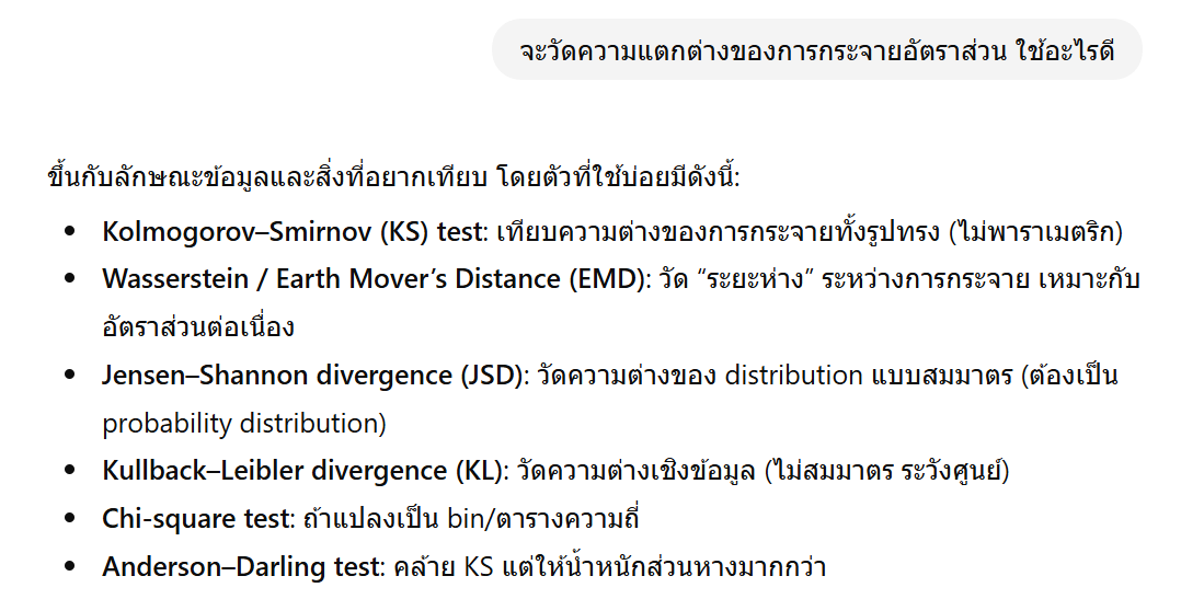 ด้วยเหตุนี้ Jensen-Shannon Divergence จึงเป็นวิธีการวัดความแตกต่างของการกระจายของอัตราส่วนที่นิยมใช้กันมากกว่า ถ้าคุณลองไปเสิร์ชหรือถาม AI ว่าถ้าจะวัดความแตกต่างของการกระจายอัตราส่วนควรใช้อะไรดี Jensen-Shannon Divergence ก็จะโผล่ขึ้นมาให้เห็นเป็นอันดับแรก ๆ
