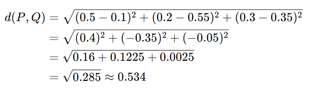 วิธีที่ตรงไปตรงมาที่สุด นั่นคือมองคะแนนแต่ละแบบเป็นเวกเตอร์ นั่นคือ P = [0.5 0.2 0.3] และ Q = [0.1 0.55 0.35] และหาระยะห่างระหว่างเวกเตอร์สองอันนี้ นั่นคือ