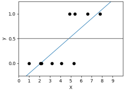 จากภาพจะเห็นค่า สำหรับ X ที่มีค่าน้อย ๆ เราจะทำนายว่า y=0 และสำหรับ X ที่มีค่ามาก ๆ เราจะทำนายว่า y=1 แต่เราจะแบ่งมันตรงไหนดีล่ะ