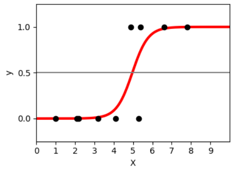 อย่างตัวอย่างในรูปข้างบนจะเห็นว่า ถ้า x มีค่าน้อยกว่า 3 เราแทบจะมั่นใจ 100% ว่าข้อมูลต้องอยู่ในกลุ่ม 0 ในขณะที่ถ้า x มีค่ามากกว่า 7 เราก็แทบจะมั่นใจอีกเช่นกันว่าข้อมูลต้องอยู่ในกลุ่ม 1 ชัวร์ ๆ ส่วนระหว่าง 3 ถึง 7 นั้นก็เป็นบริเวณที่เราไม่แน่ใจ ด้วยความน่าจะเป็นที่ต่างกันไปตามเส้นสีแดง ซึ่งถ้าอยากฟันธงลงไปจริง ๆ ว่ามันอยู่คลาสไหน เราก็จะต้องตั้งเกณฑ์ขึ้นมา เช่นถ้าเส้นสีแดงเกิน 0.5 เราจะสรุปว่ามันอยู่กลุ่ม 1 ถ้าต่ำกว่าก็อยู่กลุ่ม 0 ไป แบบนี้ก็ได้