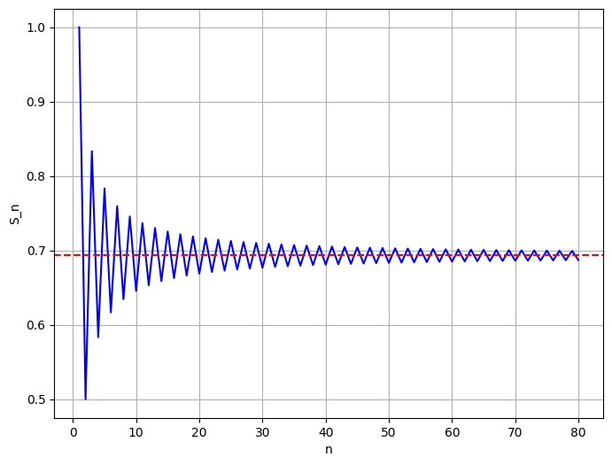 คือถ้าเราบวกมันไปตรง ๆ ที่แปลว่าเริ่มต้นจาก 1 ลบ 1/2 แล้วเอามาบวก 1/3 แล้วลบ 1/4 ไล่ไปเรื่อย ๆ ตามลำดับนี้ ค่าที่เราจะได้คือ ln(2) ฮะ ผมจะไม่ทำให้ดูนะว่ามันได้ ln(2) แต่ขอ plot เป็นกราฟให้ดูแทน