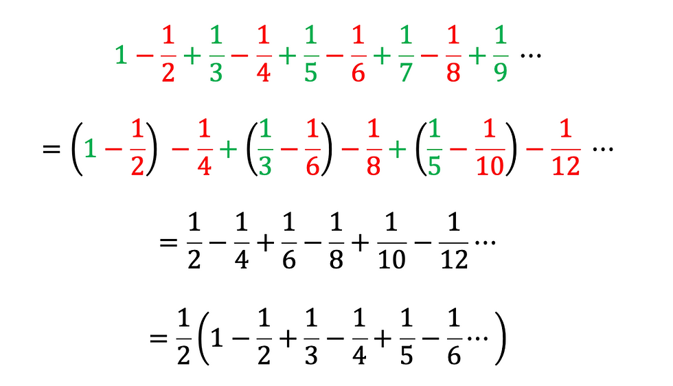 ผลที่ได้คือมันจะกลายเป็นแค่ครึ่งเดียวของผลบวกตัวเดิมของเรา ซึ่งคือ (1/2)ln(2) เฉยเลย นั่นแหละฮะที่ผมบอก แค่เราสลับตำแหน่งและจัดกลุ่มใหม่ ผลบวกที่ได้ก็เปลี่ยนไปแล้ว ซึ่งพอมาถึงตรงนี้ บางคนที่อาจอยู่ก็อาจจะกำลังรู้สึกว่า โอ้ว แย่แล้ว แปลว่าคณิตศาสตร์ที่ฉันเรียนมาทั้งหมดนั้นผิดหรอ ครูที่สอนกฎการสลับที่กับกฎการจัดกลุ่มนั้นสอนมั่วมาตลอดเลยหรอออ