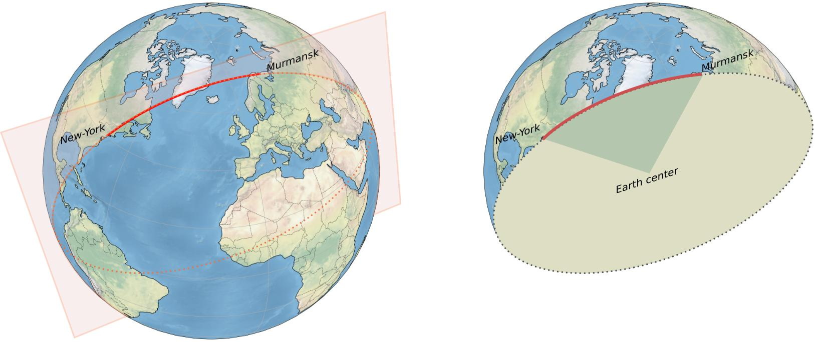 ข้อเท็จจริงนี้ขัดกับสามัญสำนึกของเรามากกว่าเดิม ทำไมเส้นทางสีแดงที่ดูอ้อมกว่าเห็น ๆ กลับใช้ระยะทางน้อยกว่า และเหตุผลที่อยู่เบื้องหลังข้อเท็จจริงแสนประหลาดนี้ก็คือ เพราะโลกของเรามันเป็นทรงกลม และเส้นตรงบนทรงกลมกับเส้นตรงบนแผนที่มันเป็นคนละเรื่องกัน