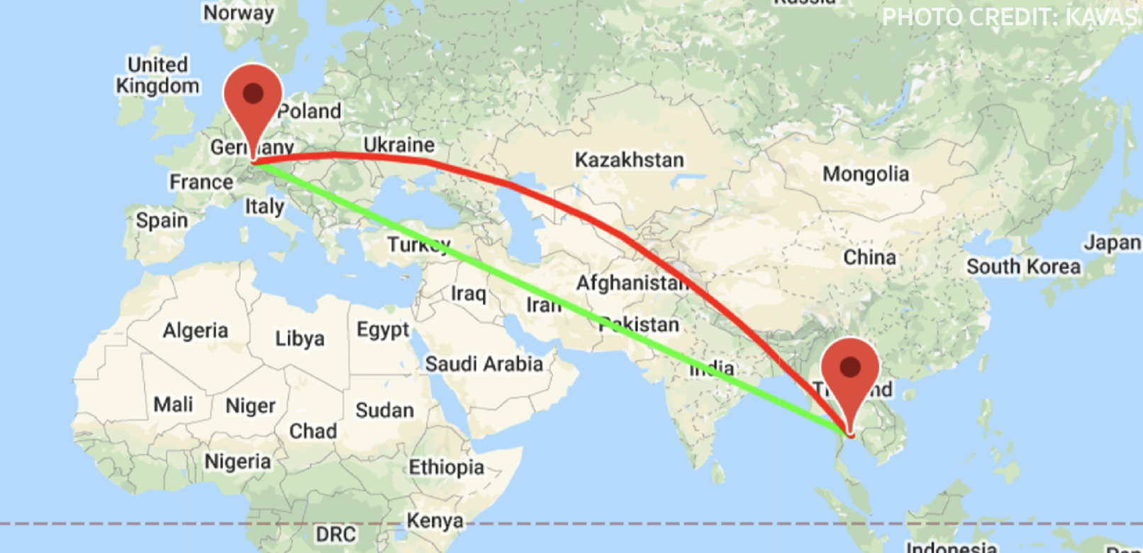 ผมเก็บคำถามนี้ไว้ในใจ จนกระทั่งได้มารู้คำตอบว่าความจริงแล้วเครื่องบินมันไม่ได้บินอ้อม มันก็บินเป็นเส้นตรงอย่างที่มันควรจะบินนั่นแหละ ถ้าเราลองคำนวณระยะทางดูจริง ๆ จะพบว่า ระยะทางตามเส้นสีเขียวนั้นเท่ากับ 9,178 กิโลเมตร ในขณะที่เส้นทางสีแดงที่ดูจะอ้อมกว่านั้นมีระยะทางเท่ากับ 8,866 กิโลเมตรเท่านั้นเอง