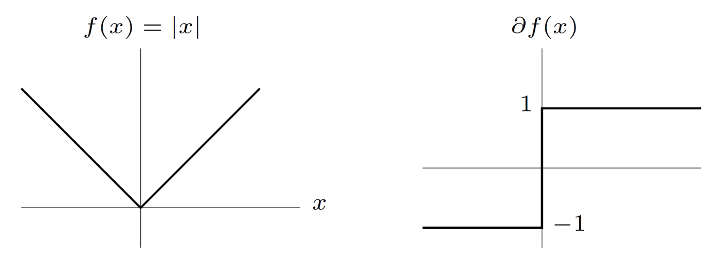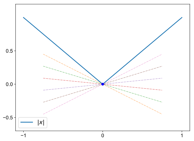 จากรูปจากเห็นว่า เส้นตรง y=ax ที่ a ตั้งแต่ -1 ถึง 1 นั้นล้วนแต่สัมผัสอยู่ข้างใต้ฟังก์ชัน f(x)=|x| ดังนั้นถ้าเรานิยามให้ subderivative คือความชันของเส้นตรงที่สัมผัสอยู่ข้างใต้ฟังก์ชันที่จุดนั้น แปลว่า subderivative ของฟังก์ชัน f(x)=|x| ที่จุด 0 นั้นคือค่าอะไรก็ได้ในช่วงปิด [-1,1]