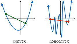 เพื่อความง่าย เราจะเริ่มจากฟังก์ชันที่มีสมบัติ convex นั้นคือห้อยลงมาข้างล่างก่อน คือปกติแล้วเรานิยาม derivative ว่าเป็นความชันของเส้นตรงที่ 'สัมผัส' กับฟังก์ชันที่จุดนั้น ๆ ถูกไหมฮะ แต่สำหรับ subderivative เรานิยามให้เป็นความชันของเส้นตรงที่ 'สัมผัสอยู่ข้างใต้' ฟังก์ชันที่จุดนั้น ๆ ฮะ ซึ่งจะเห็นว่าสำหรับฟังก์ชัน f(x)=|x| นั้น เราสามารถหาเส้นตรงมาสัมผัสอยู่ข้างใต้ฟังก์ชันของเราที่จุด 0 ได้เยอะไปหมดเลย