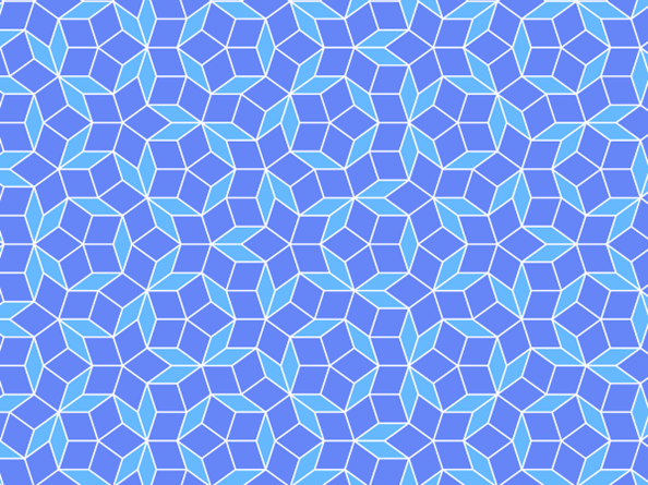 จากนั้นก็มีคนทำได้ด้วยการใช้รูปทรงแค่ 104 ชิ้น และในปี 1974 คุณโรเจอร์ เพนโรส (Roger Penrose) นักฟิสิกส์-คณิตศาสตร์จากมหาวิทยาลัยออกซ์ฟอร์ด ก็คิดค้นจนเหลือรูปทรงเพียงสองชิ้นเท่านั้น