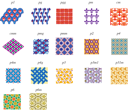 นักคณิตศาสตร์พบว่า ด้วยการแปลงเชิงสมมาตรพื้นฐานทั้งสี่แบบนี้ ท่ามกลางลวดลายที่ดูแตกต่างหลากหลาย แท้จริงแล้วมีโครงสร้างลวดลายที่แตกต่างกันแค่ 17 แบบเท่านั้น ตามรูปข้างล่างนี้เลย