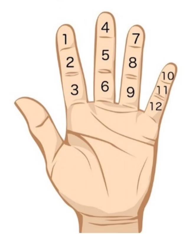 พอครบ 12 ปุ๊บ คุณก็กางนิ้วโป้งขวาออกมา เพื่อบอกว่าคุณนับได้ 12 ไปได้หนึ่งครั้งแล้ว จากนั้นก็เริ่มจิ้มนิ้วโป้งซ้ายที่ตำแหน่ง 1 ใหม่ พอครบอีก 12 ก็กางอีกนิ้วที่มือขวาออกมา มือขวาของคุณมี 5 นิ้ว เพราะฉะนั้นคุณก็จะสามารถนับ 12 ไปได้ 5 ครั้ง รวมแล้วก็คือ 60 นั่นเอง